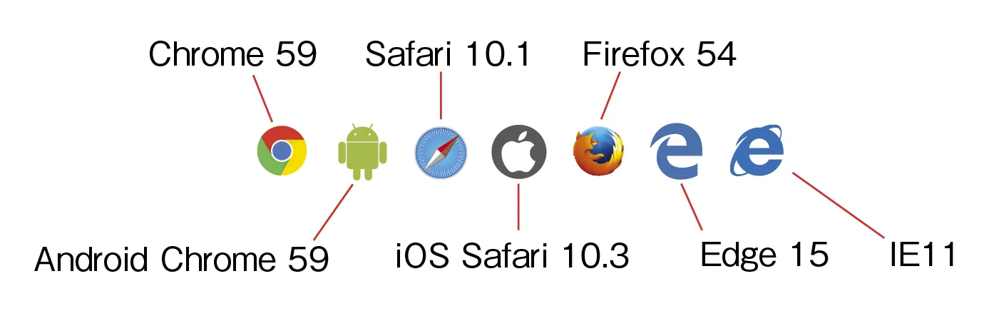 ベータ版(Chrome 60以降/Safari 11/iOS Safari 11/Firefox 55)が対応している場合はアイコンの下にバージョンを記載しています。