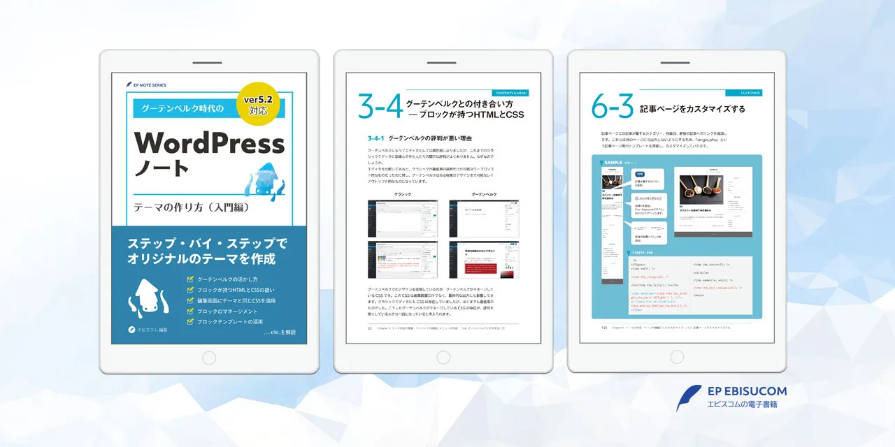 『グーテンベルク時代のWordPressノート テーマの作り方(入門編)』は、WordPress 5.xの新しいブロックエディタ「Gutenberg(グーテンベルク)」を活かしたオリジナルテーマの作成方法をステップ・バイ・ステップで解説した入門書です。