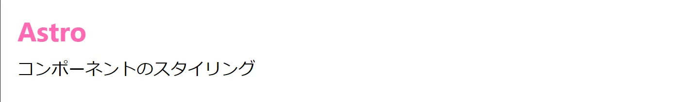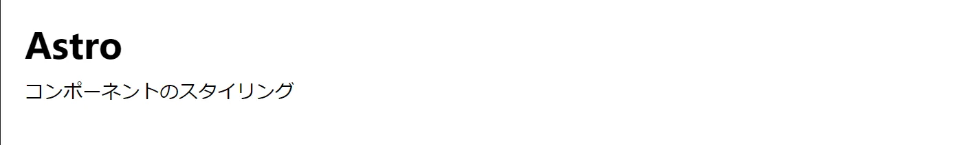 <div class="astro-5BHW53E2"> <h1 class="astro-5BHW53E2">Astro</h1> <p class="astro-5BHW53E2">コンポーネントのスタイリング</p></div>さらに、適用したスタイルにも同様のクラスが追加され、コンポーネントレベルのスコープが実現されます。