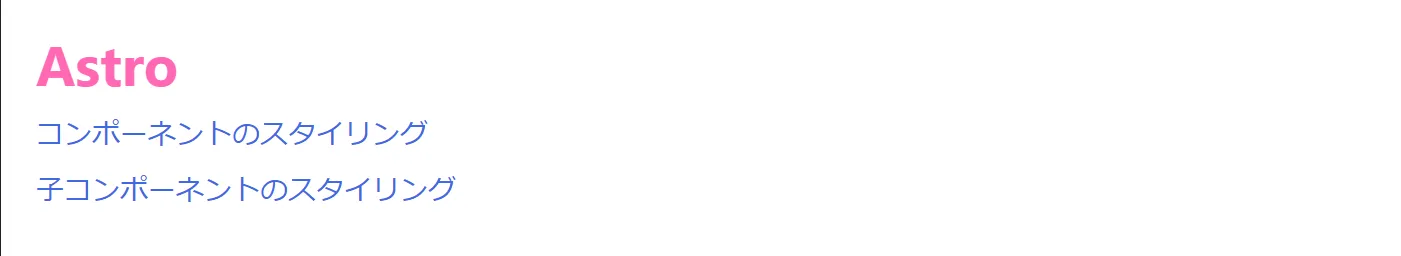 <div class="astro-5BHW53E2"> <h1 class="astro-5BHW53E2">Astro</h1> <p class="astro-5BHW53E2">コンポーネントのスタイリング</p> <p class="text astro-5BHW53E2">子コンポーネントのスタイリング</p></div>.text:where(.astro-5LZXASO4) { color: royalblue;}
