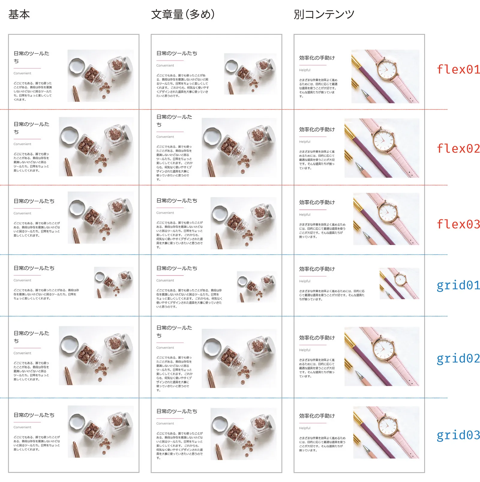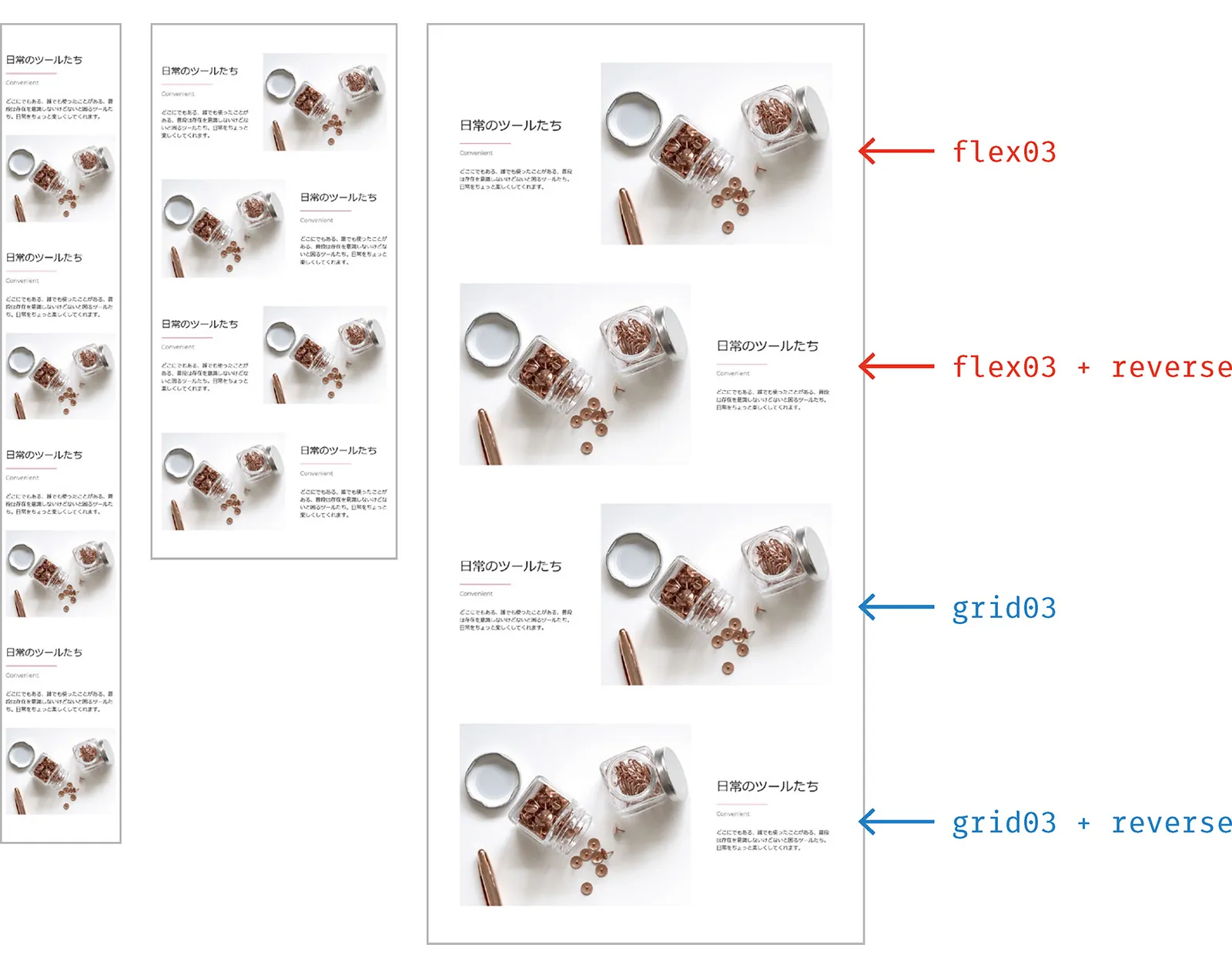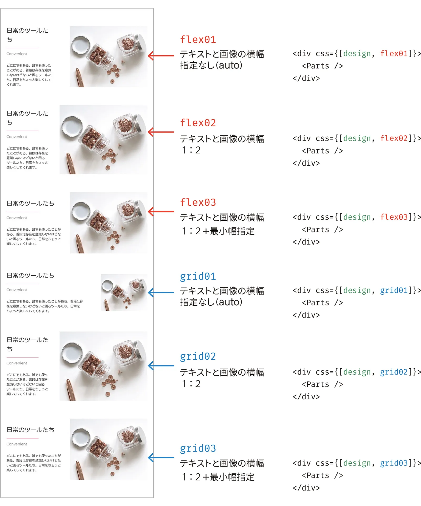 const Page = () => { return ( <Layout> <div css={[design, flex01]}> <Parts /> </div> <div css={[design, flex02]}> <Parts /> </div> …略… <div css={[design, grid03]}> <Parts /> </div> </Layout> )}