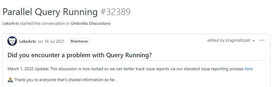 Issuesを探してみると、Parallel Query Runningは大飯食らいのようでオプションを色々設定してもねじ伏せるのは現状では不可能。なので、問題を抱えているならv3に帰るのが現状の解決策と言う話に。