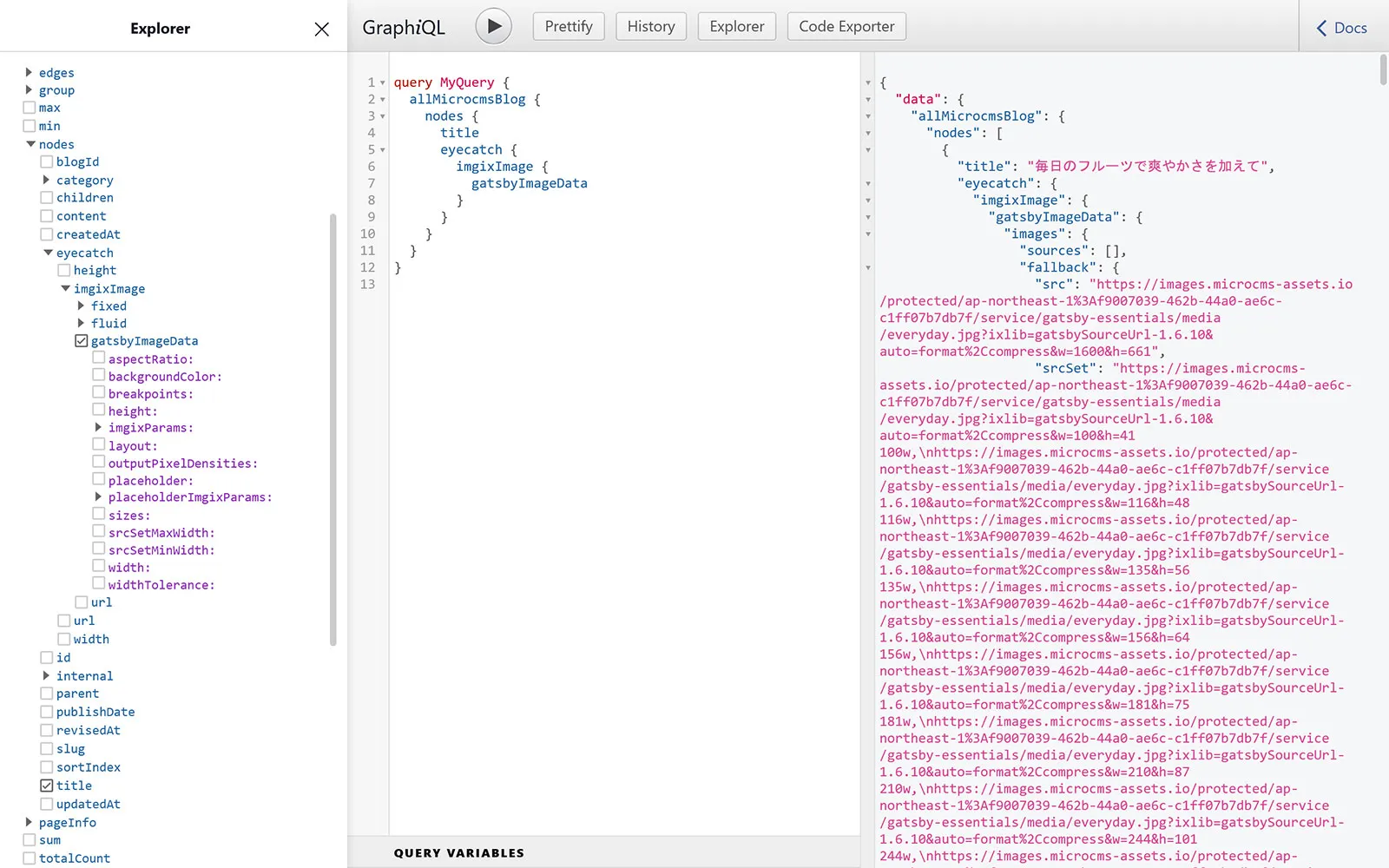 module.exports = { //... plugins: [ { resolve: `@imgix/gatsby`, options: { domain: 'images.microcms-assets.io', defaultImgixParams: { auto: 'format,compress' }, fields: [ { nodeType: "MicrocmsBlogEyecatch", fieldName: "imgixImage", getURL: node => node.url.replace("https://images.microcms-assets.io/", "") }, ], }, }, ],};これで、GraphQL から gatsbyImageData を取得できますので、GatsbyImage で利用可能になります。