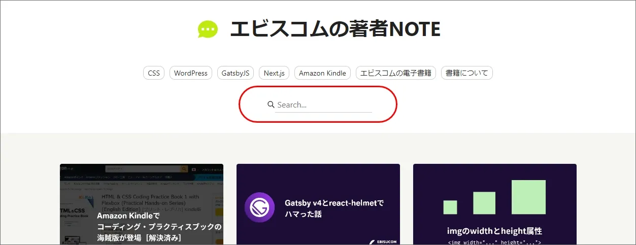 エビスコムのサイトでは、著者NOTEのページに検索機能を組み込んでいます。外部のサービスを利用しようかとも考えましたが、そのうち関連記事も組み込みたいということで、各記事の形態素解析を行い、キーワードの抽出を行う形で検索機能を組み込みました。