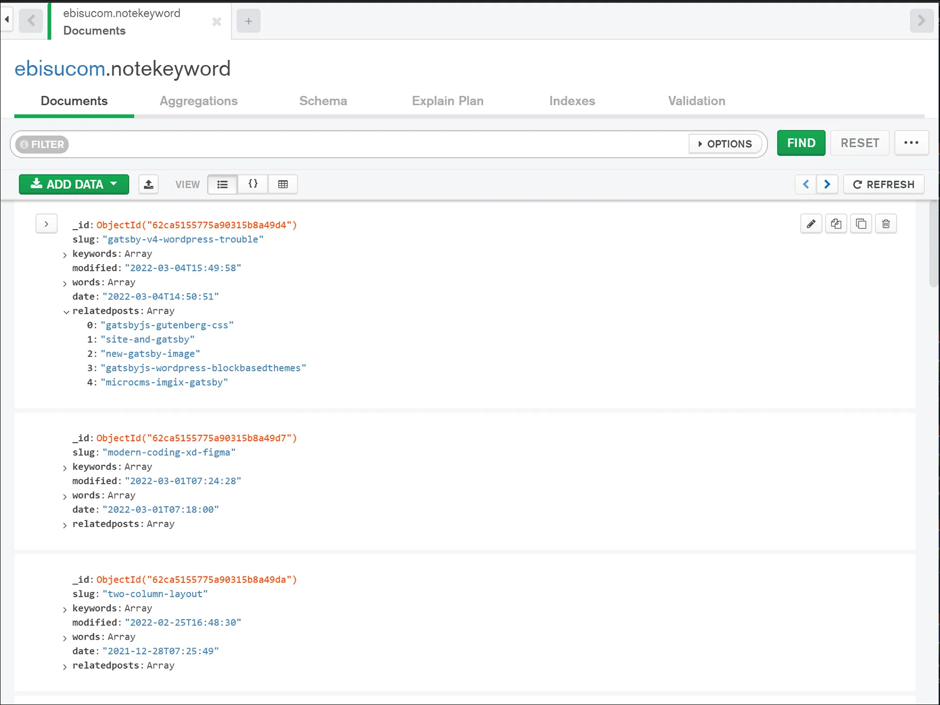 gatsby-v4-react-helmet [ { slug: 'gatsby-v4-wordpress-trouble', similarity: 0.175817 }, { slug: 'gatsbyjs-gutenberg-css', similarity: 0.097883 }, { slug: 'microcms-imgix-gatsby', similarity: 0.089381 }, { slug: 'site-and-gatsby', similarity: 0.085722384 }, { slug: 'file-system-route-api', similarity: 0.08334787199999999 },]こうして出来上がったデータですが、Gatsbyで扱うことが目的です。JSONファイルとして出力して、gatsby-transformer-jsonで読み込むのがシンプルですが、JSONファイルの扱いでトラブルになりそうなので、今回はMongoDBにデータベースを用意することにしました。