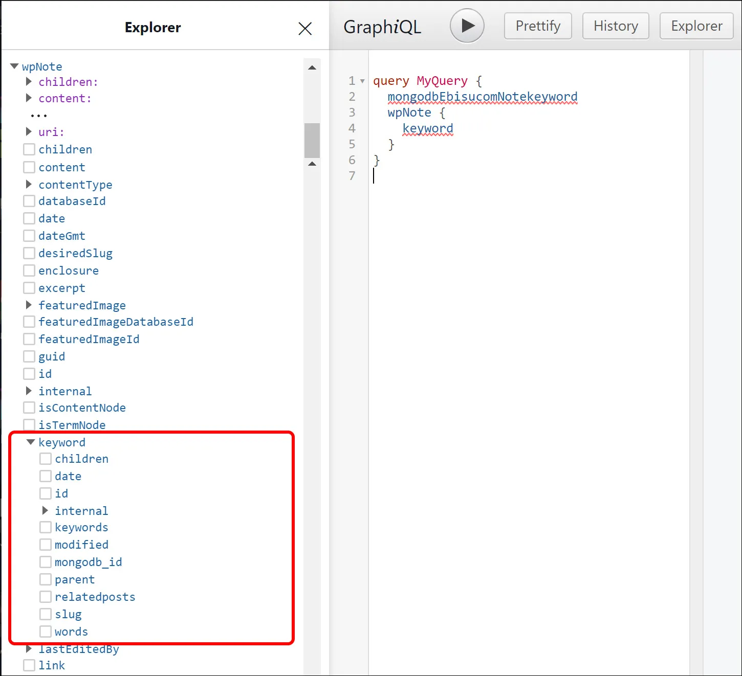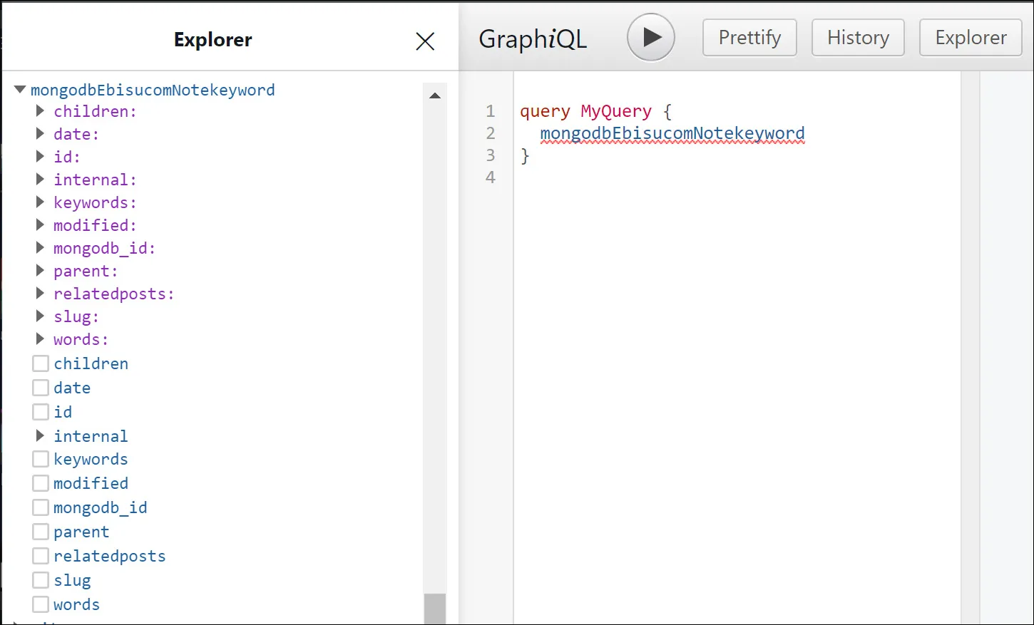 const { createTypes } = actions createTypes(` type WpNote implements Node { keyword: mongodbEbisucomNotekeyword @link(from: "slug" by: "slug") } `)}これで、WordPress側のWpNoteというノードにkeywordというフィールドを追加し、そこにMongoDBから読み込んでいるノードを繋いでくれます。繋ぐ際には、両方のノードのslugが一致しているものを繋ぐように指定しています(この場合、 by: "slug"だけでも機能します)。