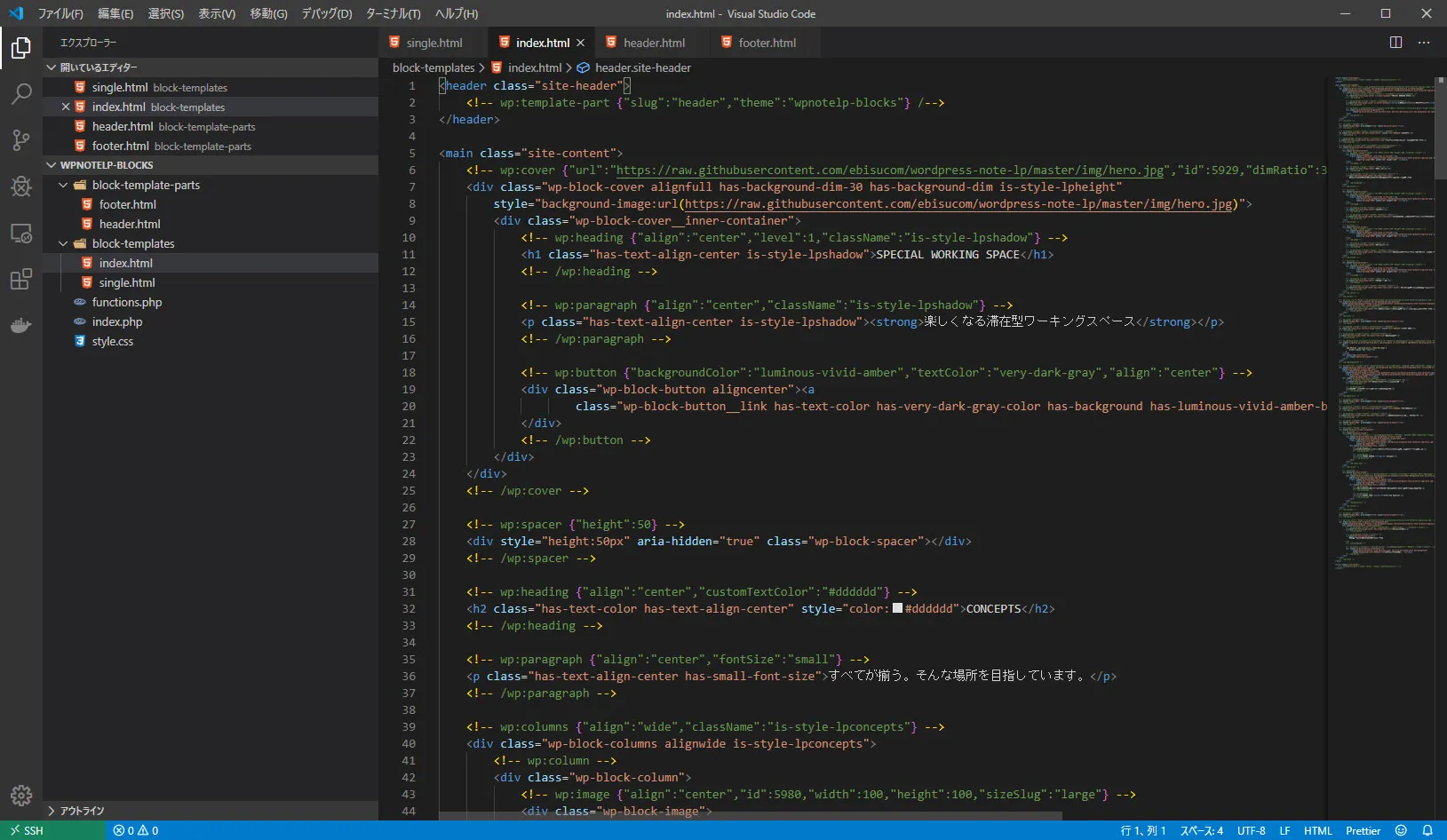 ただ、エディタがまだうまく機能してくれないようで、各エディタ上でブロックを並べてデザインを仕上げたら、コードエディターに切り替えて、コードをそれぞれのテンプレートファイル(HTMLファイル)へとコピーしてやります。