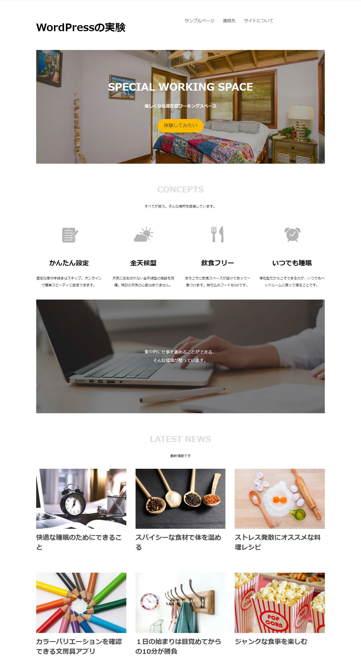 Stackableのブロックを利用して最新記事を表示していますが、そのあたりも問題ありません。ブロックさえ用意できれば、実用的なサイトはすでに実現可能な状態になっています。