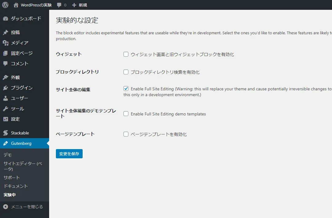 最新のGutenbergのプラグインをインストールして、メニューから[Gutenberg > 実験中]を選択。「サイト全体の編集」をチェックすることで、試すことができます。(ただし、サイトを元に戻せなくなる可能性があるので、開発環境で試すようにとの注意書きがあります)